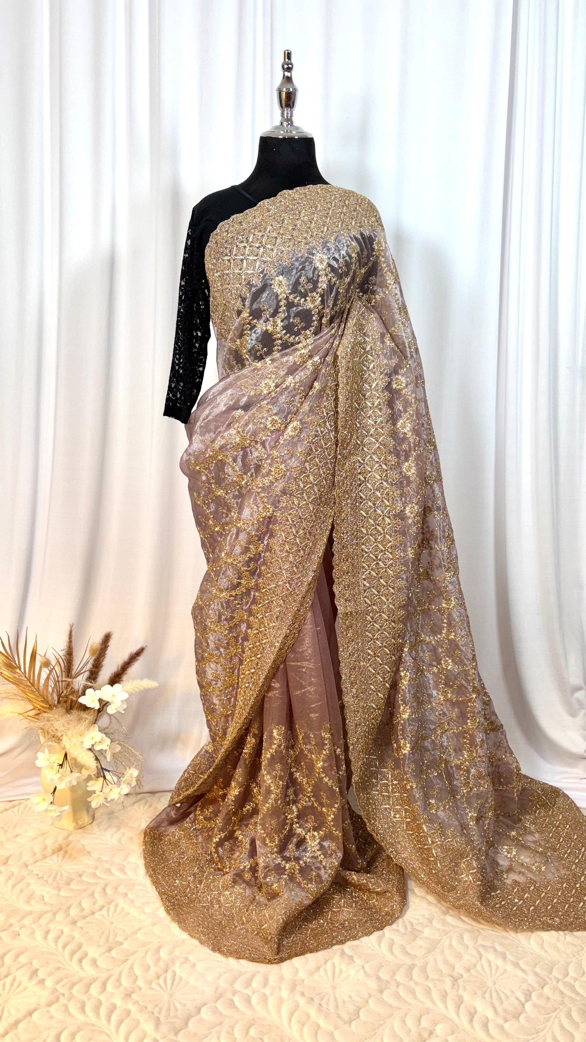 Lesaree Lilas de Minuit, réalisé en tulle fin délicat, se distingue par son mariage subtil de violet clair et gris doux, rehaussé de strass scintillants qui illuminent la silhouette. Il se drape selon l’art traditionnel, offrant un mouvement fluide et naturel, tout en célébrant l’élégance intemporelle de la féminité.