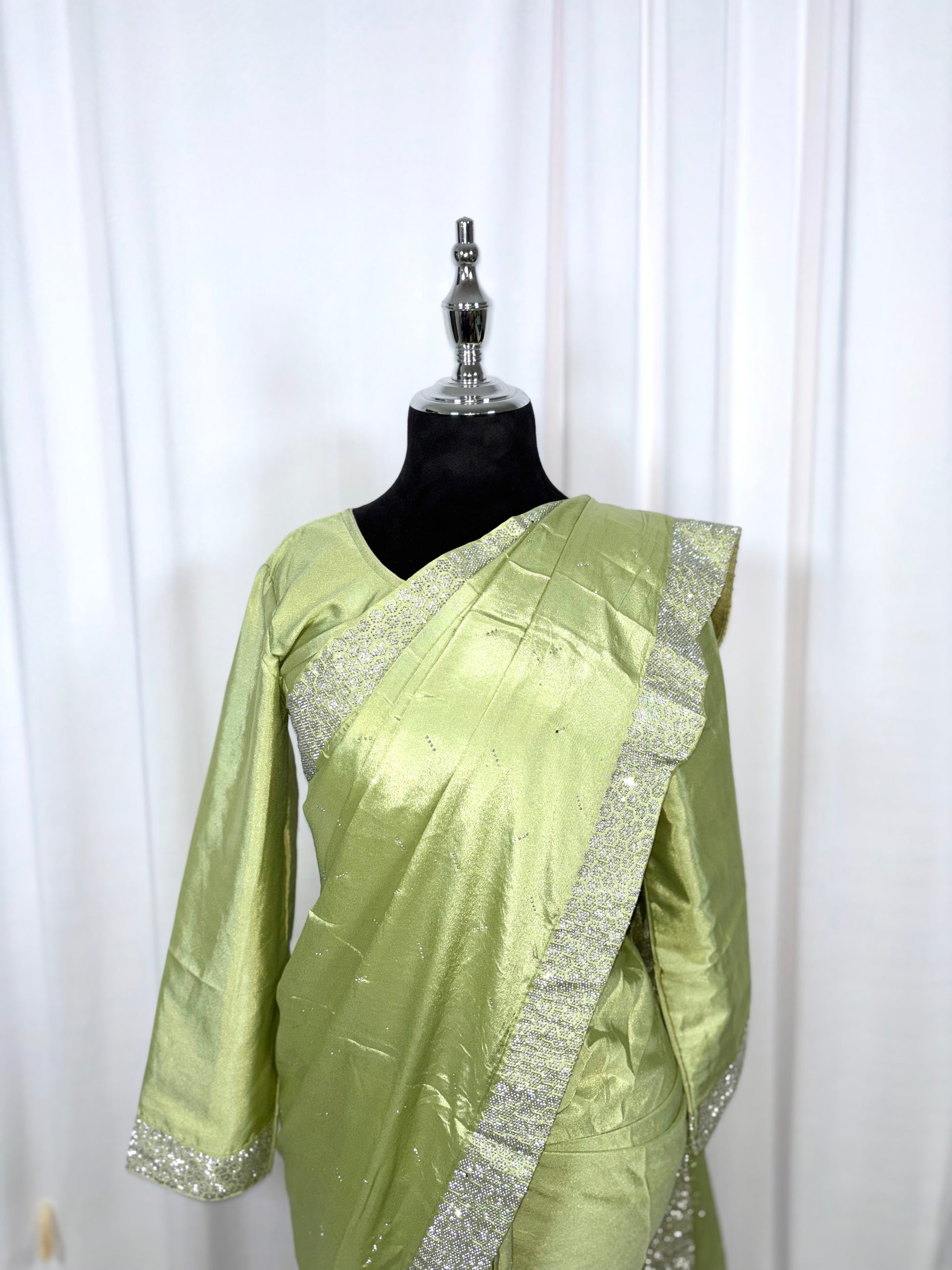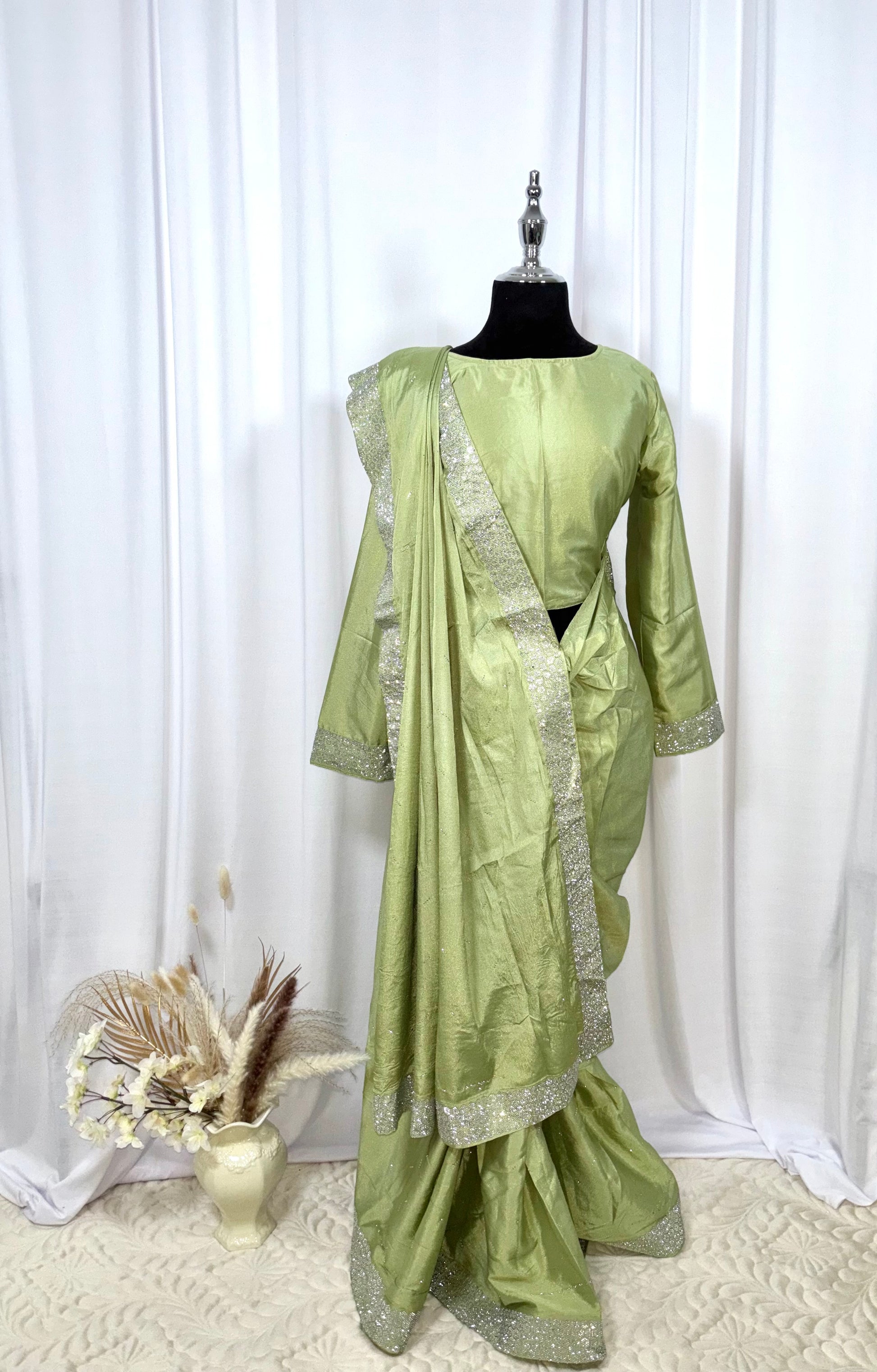 Le One Minute Saree Verte Aura associe le vert tilleul frais à la brillance discrète des strass argentés. Sa couleur douce, rappelant une brise printanière, est mise en valeur par des éclats subtils qui captent la lumière. Facile à porter en une minute, il épousera votre silhouette avec élégance, idéal pour des événements où vous souhaitez rayonner en toute simplicité.